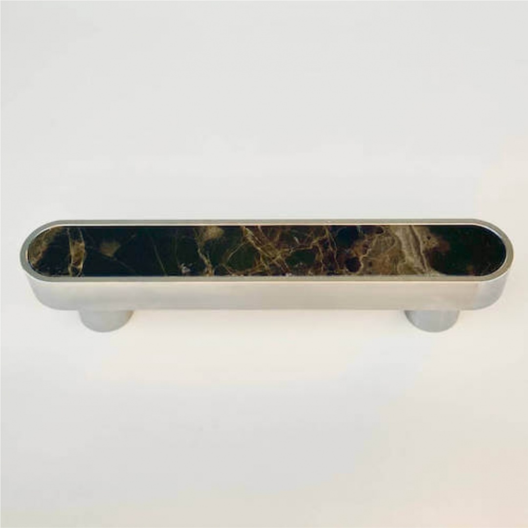 Reling ze stali nierdzewnej, zdobiony naturalnym kamieniem, sprowadzonym z Hiszpanii marmurem Emperador Dark. Każdy z nich ma swoj niespotykany wzór lecz cechą główna jest ciepłe, czekoladowe tło z ciemniejszym użyleniem oraz rzadkie krystaliczne wtrącenia. Pięknie będzie kontrastować z białymi frontami kuchennymi ale także świetnie wpasuje się w dębowe lub orzechowe forniry mebli Art Deco.